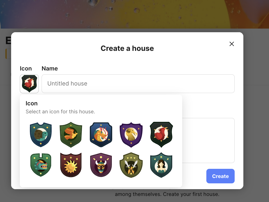 5. In a pop-up window, add a house name, a house description, and click on the icon to choose one from the variety of options. Once you add all the information, click on 'Create'.