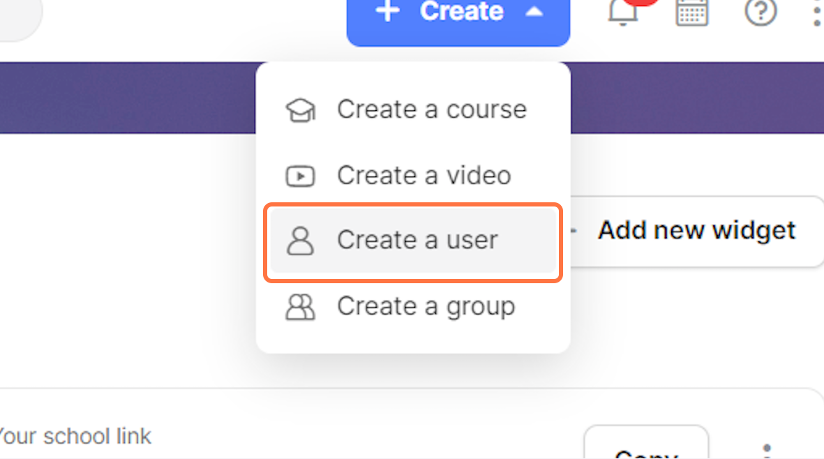 To add users to the LMS, click on the blue 'Create' button in the right upper corner and select 'Create a user' from the drop-down menu.
