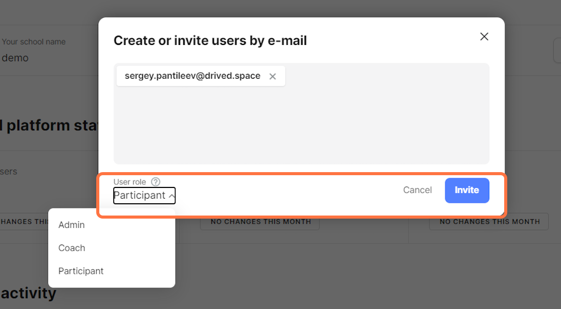 2. Choose the user role from the drop-down menu in the lower left corner, and click on ‘Invite’.