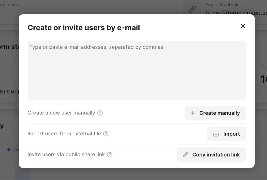 A pop-up window will appear, and you will be presented with 4 different options to add users to the platform. Let’s go through each of these options.