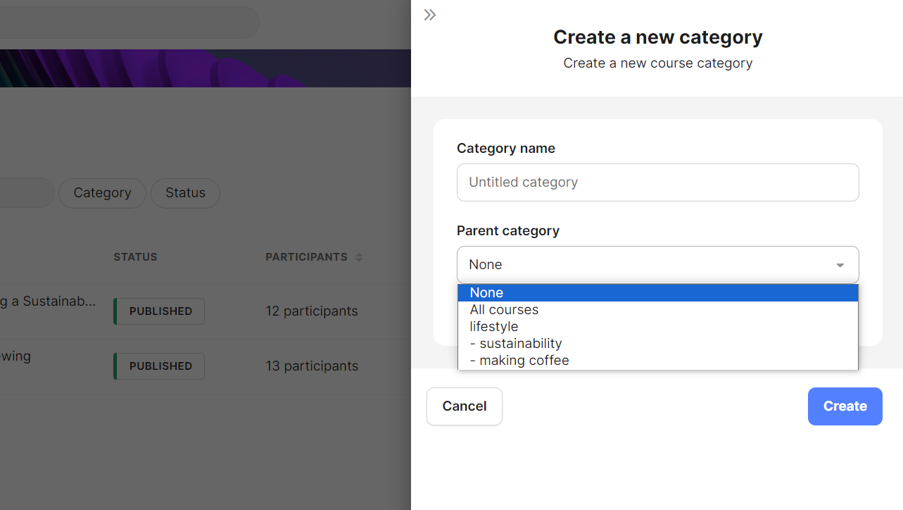 A category is a feature that allows you to filter all courses within a specific topic. You can create a course category in the Courses catalog or on the specific course page. Let’s check both options.